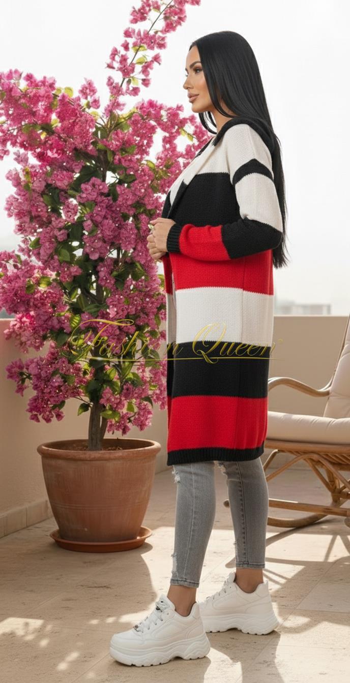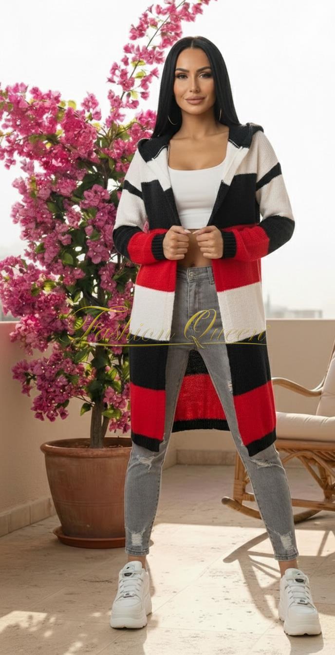 Tento štýlový dlhý pletený kardigán s kapucňou v pútavom trojfarebnom pruhovanom dizajne je ideálnym kúskom na vrstvenie, ktorý dodá vášmu outfitu moderný šmrnc a potrebné pohodlie.