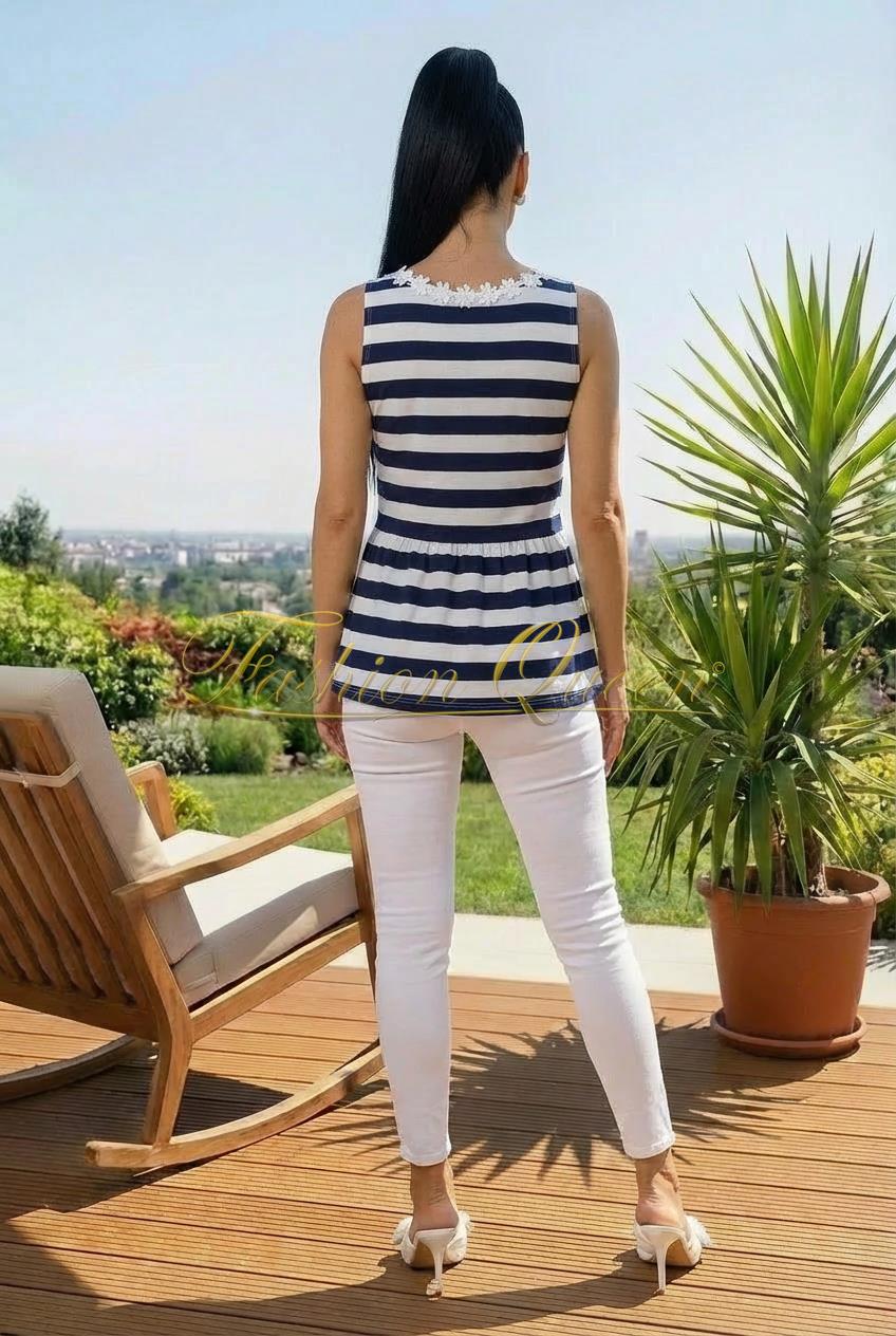 Krásny pásikavý top v oblasti dekoltu zdobený kvetinkami je skvelý kúsok na leto. Zladíte ho k čomukoľvek a určite v ňom vyniknete.