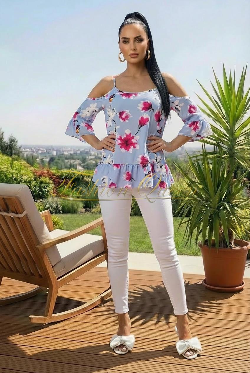 Krásny kvetovaný top s odhalenými ramenami môžete kombinovať k elegantným nohaviciam, džínam aj šortkám. Je to univerzálny kúsok, ktorý využijete najmä počas teplejších dní. Farby oživia váš šatník.