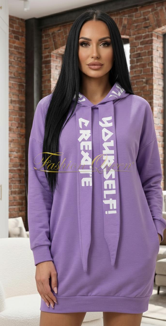 Tieto štýlové mikinové šaty v sýtej fialovej farbe kombinujú maximálne pohodlie s moderným mestským dizajnom. Výrazné široké šnúrky s nápisom a praktický strih s vreckami z nich robia ideálny kúsok pre váš voľný čas aj štýlový outfit do mesta.